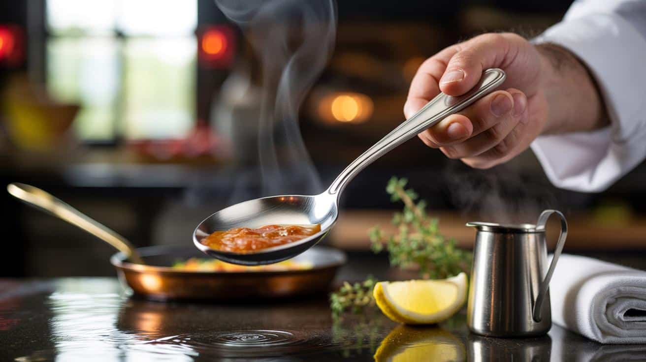 Nejčastěji nejde o techniku, která jídlo pokazí, ale o dochucení. Sůl je ta čára, která vše ostatní oživuje. Na konzistentní lžičce kuchaři cítí sůl nejen chutí, ale i vnímáním, protože tekutina vždy přejíždí po stejné ploše. Okraj lžičky důkladně rozprostře omáčku, takže účinek solných krystalů je okamžitý, jasný a nelze si nic namlouvat.