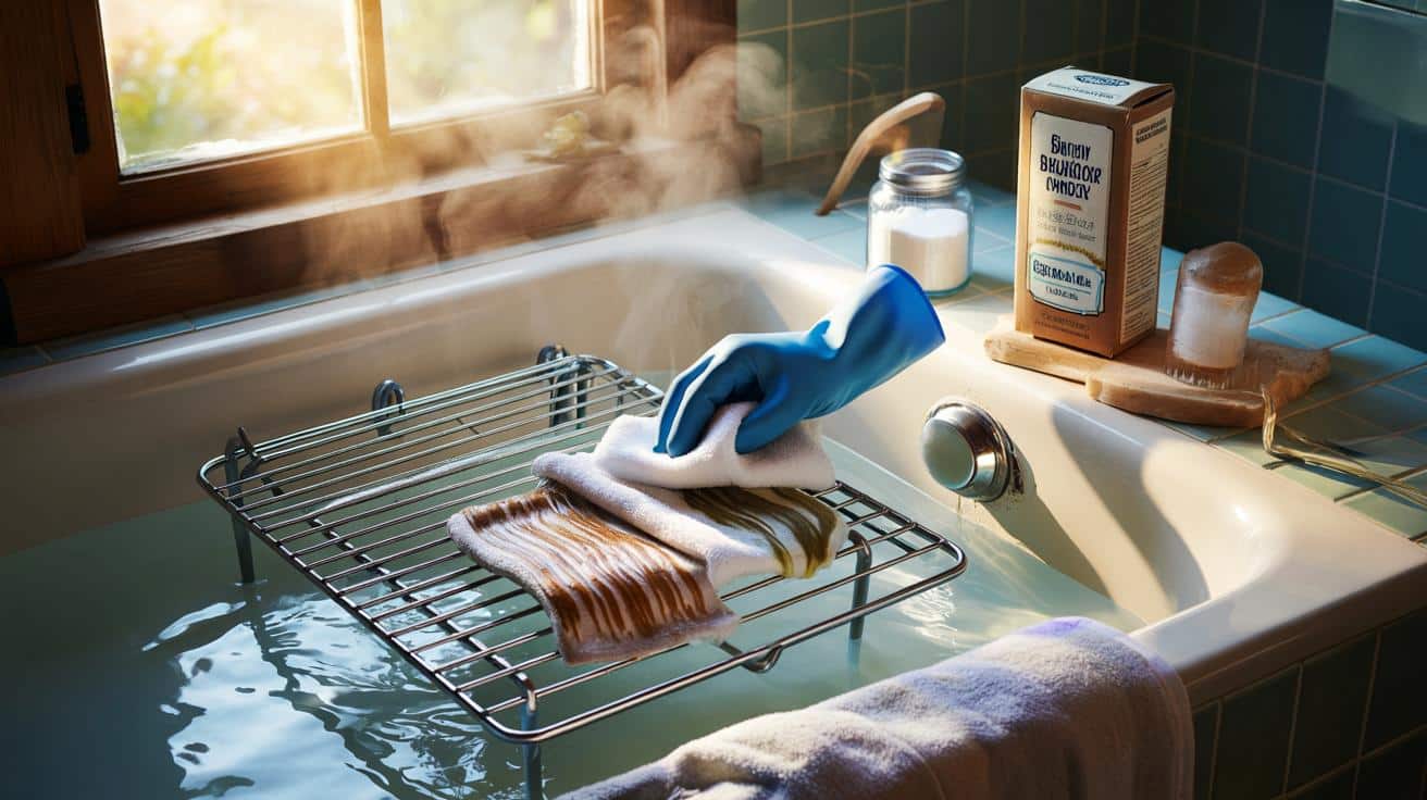 Ve vaně rozložíte starý ručník, aby nehrozilo poškrábání. Na něj opatrně položíte rošty trouby a uzavřete odtok. Napustíte nejteplejší vodu, která je k dispozici, tak, aby byly rošty ponořené aspoň o pár centimetrů. Přidáte 1 vrchovatou šálek enzymatického pracího prášku a 1 šálek sodových krystalů, poté vodu promícháte dřevěnou lžící, dokud znepokojivě nezakalí. Necháte to tak, ponecháte dveře trochu pootevřené, zavřete záchodová dvířka, a zajistíte, aby zvířata a děti neměly přístup. Jdete spát. Ráno si nasadíte rukavice, vypustíte vodu a každý tyč pečlivě otřete měkkým hadříkem nebo houbou. Důkladně opláchnete a necháte uschnout. **Funguje to, zatímco spíte.**